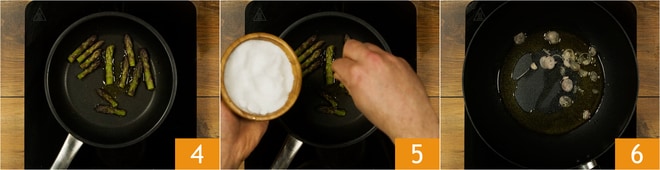 Versez un filet d'huile dans une poêle, faites-la chauffer et ajoutez les pointes des asperges 4 qui devront griller uniformément. Ajoutez une pincée de sel pour assaisonner 5 et laissez cuire environ 2 minutes. Dans une autre poêle, chauffez encore un peu d'huile et dès qu'elle est chaude, ajoutez l'échalote et faites-la légèrement revenir en veillant à ne pas la brûler 6.