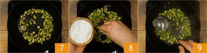 Après quelques instants, ajoutez également les tiges des asperges 7, laissez-les cuire à feu moyen en ajoutant une bonne pincée de sel 8. Faites cuire environ 10 minutes et, si nécessaire, ajoutez également une louche d'eau chaude 9.