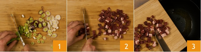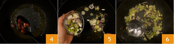 Faites rissoler le speck pendant environ 3-4 minutes à feu moyen, en remuant souvent. Lorsqu'il est doré, retirez-le de la poêle 4. Dans le même fond de cuisson, ajoutez le cébette 5 et laissez étuver à feu doux pendant environ 5 minutes en versant un peu d'eau chaude 6.