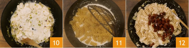 Rectifiez l'assaisonnement avec du sel et du poivre, en prenant soin de ne pas exagérer car le speck est déjà très salé, et mélangez le tout 10. Égouttez les pâtes dans la poêle 11, ajoutez le speck et mélangez bien 12. Voilà, vos pâtes robiola et speck sont prêtes.