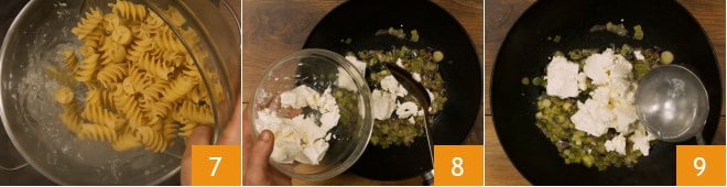 Faites maintenant cuire les pâtes dans l'eau bouillante salée et cuisez-les al dente 7. Lorsque le cébette est tombé, éteignez le feu et ajoutez la robiola 8 avec une louche d'eau de cuisson des pâtes 9.