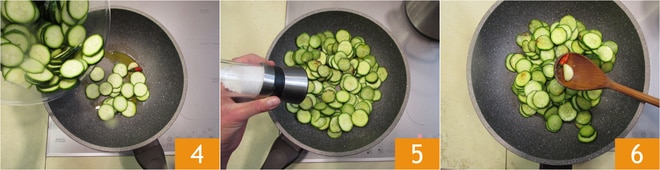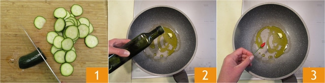 Pour préparer les pâtes au four avec crème de courgettes, commencez par laver, équeuter et couper en rondelles d'environ 1/2 cm les courgettes 1. Versez un filet d'huile d'olive vierge extra dans la poêle, ajoutez l'ail 2 et le piment écrasé 3 mais non haché. Laissez revenir pendant 2-3 minutes.