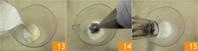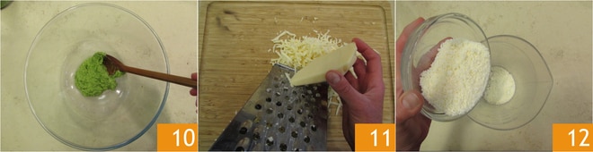 Versez la crème obtenue dans un grand bol 10. Râpez l'Edamer 11 avec une râpe à gros trous et réservez. Dans un autre verre haut, versez le Parmigiano Reggiano DOP râpé finement 12.