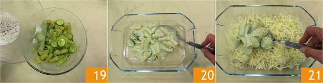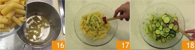Faites cuire les pâtes dans de l'eau bouillante salée à votre goût 16 et égouttez-les al dente 16. Égouttez les pâtes dans le bol avec la crème de courgettes 17 et ajoutez également les courgettes restantes 18.