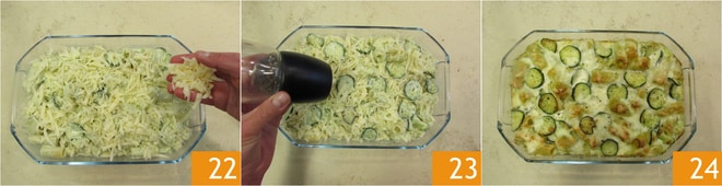 Terminez avec l'edamer râpé restant 22, des courgettes en rondelles et une pincée de poivre 23. Faites cuire dans le four statique à 210° pendant 5 minutes, puis 5 minutes supplémentaires sous le gril. Sortez du four et parfumez avec des herbes aromatiques fraîches 24.