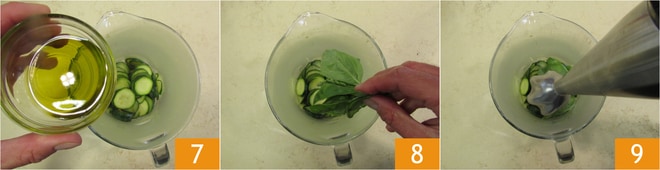 Prélevez la moitié des courgettes, transférez-les dans un grand verre avec 20 g d'huile d'olive vierge extra 7 et quelques feuilles de menthe selon vos goûts 8. Mixez avec le mixeur plongeant 9 pour obtenir une crème.