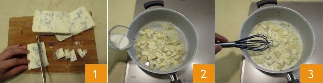Pour préparer les pâtes au gorgonzola gratinées au four, commencez par cuire les pâtes al dente dans une casserole d'eau bouillante salée. Prenez le gorgonzola, coupez-le en fines lanières puis en morceaux 1. Dans une poêle, ajoutez le gorgonzola, incorporez le lait pour diluer le fromage et le rendre crémeux 2 et mélangez avec un fouet 3.