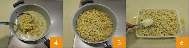 Faites cuire à feu modéré pendant 2 ou 3 minutes, jusqu'à obtenir une crème lisse. Une fois les pâtes prêtes, égouttez-les et transférez-les dans la poêle avec la sauce 4, en mélangeant bien le tout 5. Disposez les pâtes dans un plat rectangulaire de 26x18 cm et saupoudrez-les généreusement de Grana 6.