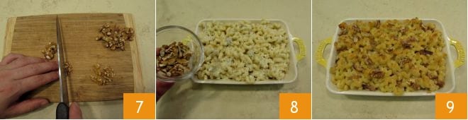 Hachez grossièrement les noix 7 et répartissez-les sur les pâtes 8. Faites cuire pendant 3-4 minutes au four en mode grill 9. Vos pâtes au gorgonzola gratinées au four sont prêtes à être servies!
