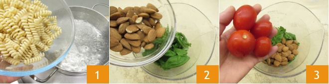 Pour préparer les pâtes au pesto de roquette et thon, commencez par mettre l'eau pour cuire les fusillis sur le feu. Quand elle bout, salez et faites cuire les pâtes 1. Pendant ce temps, préparez le pesto. Dans le bol d'un mixeur, versez la roquette, quelques feuilles de basilic, les amandes 2, les tomates 3
