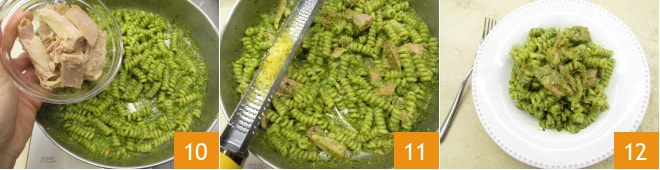 Ajoutez maintenant les filets de thon égouttés 10 et le zeste de citron râpé 11. Un dernier mélange avant de servir et dégustez immédiatement vos pâtes au pesto de roquette et thon 12.