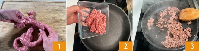 Pour préparer les pâtes avec potiron et saucisse, commencez par cette dernière. Retirez-la du boyau 1, émiettez-la avec vos mains et transférez-la dans une poêle chaude 2. Écrasez-la légèrement avec une spatule en bois et faites cuire quelques minutes 3.
