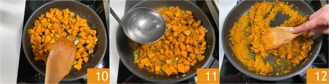 Ajoutez le potiron, mélangez bien pour l'imprégner 10. Ajoutez le romarin attaché avec un bout de ficelle et ajoutez une louche d'eau de cuisson 11. Faites cuire à feu moyen pendant 15-20 minutes, puis retirez le romarin et écrasez-le jusqu'à obtenir une purée 12. Ajoutez encore une louche d'eau.