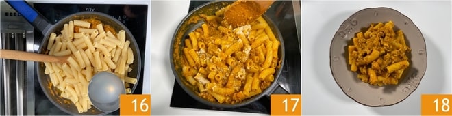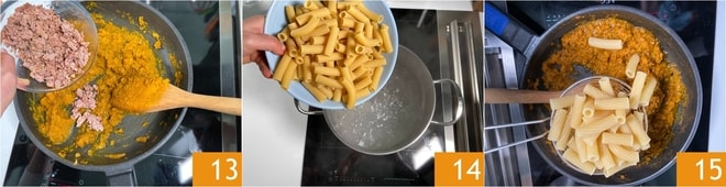 Ajoutez la saucisse à la purée de potiron et mélangez 13. Faites cuire les tortiglioni 14, égouttez-les al dente et transférez-les directement dans la poêle avec la sauce 15.