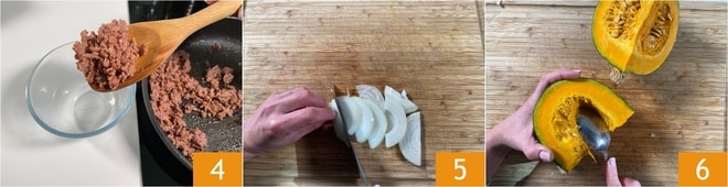 Lorsqu'elle sera bien dorée, transférez la saucisse dans un bol, couvrez d'un film plastique pour ne pas la dessécher et mettez-la de côté 4. Épluchez l'oignon, coupez-le en tranches et hachez-le finement 5. Passez au potiron : nettoyez-le en retirant les graines et les filaments internes avec une cuillère 6.