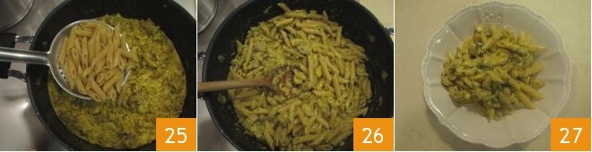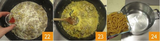 Mélangez et ajoutez également le safran en poudre (22-23). Après environ 5 minutes, vous pouvez éteindre le feu ; votre sauce est prête. Cuisez les pâtes en les gardant en dessous du temps de cuisson d'environ deux minutes par rapport à ce qui est indiqué sur le paquet 24, car vous finirez la cuisson avec le ragoût.