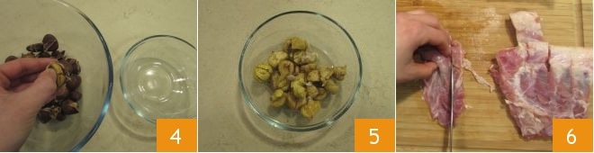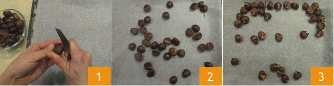 Pour préparer les pâtes avec ragoût d'agneau et châtaignes, incisez les châtaignes 1, disposez-les sur une plaque recouverte de papier sulfurisé 2 et cuisez-les dans un four statique préchauffé à 180° pendant environ 30 minutes. Une fois les châtaignes cuites 3,
