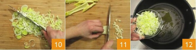 et hachez-le grossièrement 10. Réduisez aussi la tige de céleri en petits dés 11. Mettez de l'eau dans une grande casserole pour la cuisson des pâtes. Lorsque l'eau bout, salez. Entre-temps, dans une grande casserole, versez un filet d'huile, ajoutez le poireau 12,