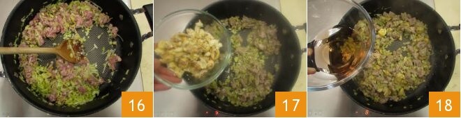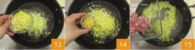 le céleri 13, le gingembre 14 et faites revenir le tout brièvement à feu doux. Augmentez la flamme, ajoutez la viande d'agneau 15,
