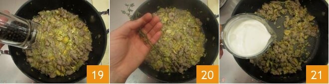 Baissez ensuite la flamme, tout en continuant à faire revenir le tout, en remuant de temps en temps : cuisez environ 10-15 minutes. Salez et poivrez 19, puis ajoutez les feuilles de thym 20 et ajoutez la crème fraîche 21.