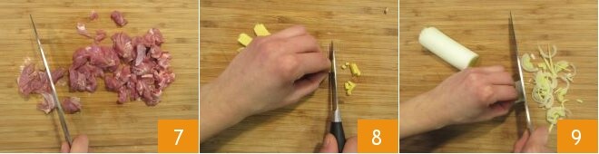 puis coupez-la encore en petits morceaux 7. Pelez et hachez le gingembre frais 8, puis effeuillez le poireau et coupez-le en fines rondelles 9