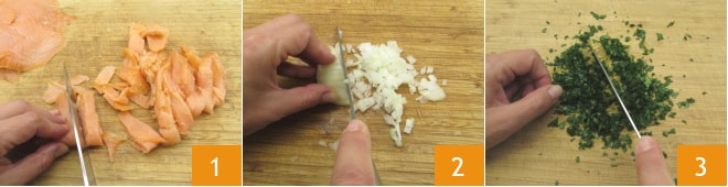 Pour préparer les pâtes au saumon, commencez par porter à ébullition une casserole d'eau pour cuire les pâtes et salez à l'ébullition. Coupez le saumon en lanières 1; ne réduisez pas le saumon en morceaux trop petits, sinon ils se désagrégeront dans la poêle. Épluchez et hachez finement l'oignon 2, puis hachez également le persil 3.