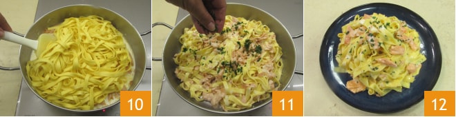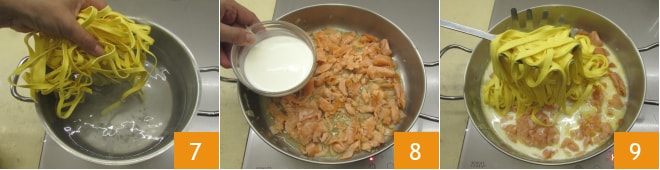 À ce stade, l'eau aura atteint l'ébullition, donc salez et faites cuire les tagliatelles selon le temps indiqué sur le paquet 7. Pendant ce temps, versez la crème dans la poêle avec le saumon, toujours hors du feu 8. Lorsque les tagliatelles sont cuites, égouttez-les et transférez-les directement dans la poêle 9.