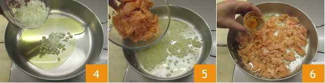 Chauffez l'huile dans une poêle et faites revenir l'oignon 4, puis ajoutez le saumon 5 et augmentez le feu. Après avoir fait sauter le saumon pendant quelques minutes, déglacez avec le cognac 6 et laissez évaporer complètement, puis éteignez le feu.