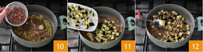 et enfin le thon en le laissant s'imprégner pendant environ une minute encore 10. À ce stade, vous pouvez ajouter les aubergines bien rincées et égouttées 11 et les faire cuire pendant 5-10 minutes. Retirez l'ail 12,