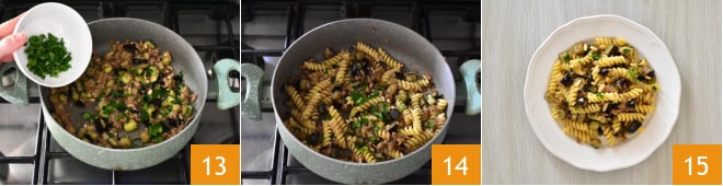 ajoutez le persil 13 et égouttez les pâtes directement dans le condiment 14. Une courte saute et vous pouvez enfin dresser vos pâtes thon et aubergines 15.
