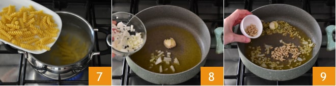 Déplacez-vous aux fourneaux et mettez sur le feu la casserole où cuire les pâtes quand elle sera bouillante, puis salez à votre goût 7. En attendant, prenez une grande casserole et préparez le condiment, laissez griller pendant une minute, à feu doux, la gousse d'ail et l'oignon 8. Versez ensuite les pignons et faites-les griller aussi pendant une minute 9