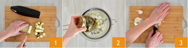 Pour préparer les pâtes aubergines et thon, commencez par laver et sécher les aubergines. Coupez-les d'abord en tranches, puis en lanières et enfin en cubes d'environ 2 cm 1. Saupoudrez les aubergines de gros sel (sans exagérer). Placez une assiette avec un poids dessus et laissez-les ainsi dégorger pendant au moins une demi-heure 2. Avant de les utiliser dans la recette, n'oubliez pas de les rincer soigneusement et de les éponger correctement. Écrasez l'ail avec le côté plat d'une lame 3,