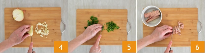 puis hachez finement l'oignon 4, hachez finement le persil 5 et émiettez, toujours au couteau, les filets de thon égouttés 6.