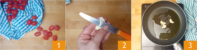 Pour préparer les fusilli avec thon et tomates cerises, préparez d'abord la sauce. Lavez, séchez et coupez les tomates cerises en deux 1. Épluchez l'ail, divisez-le en deux et retirez le germe central 2. Transférez les gousses d'ail dans une poêle avec un filet d'huile et laissez dorer 3.