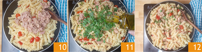 Mélangez, ajoutez le thon 10, le persil, le basilic et une cuillère d'huile d'olive extra vierge 11. Mélangez bien, éteignez le feu et servez 12.