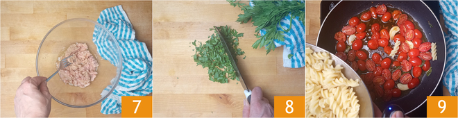 Transférez le thon dans un bol et émiettez-le avec une fourchette 7. Ensuite, hachez le persil 8 et déchirez à la main les feuilles de basilic. Dès que les pâtes sont cuites, égouttez-les et transférez-les dans la poêle avec les tomates cerises 9.