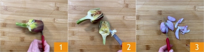 Pour préparer les pâtes aux artichauts, commencez par nettoyer les artichauts. Éliminez les feuilles extérieures les plus dures, raccourcissez et nettoyez la tige et la base, en coupant les pointes 1. Divisez ensuite l'artichaut en deux et retirez le foin intérieur 2. Coupez maintenant les artichauts en fines tranches. Passez à l'échalote : épluchez-la, coupez-la en tranches 3 et hachez-la finement.