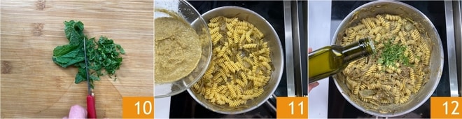 Faites cuire les pâtes al dente et pendant ce temps, coupez les feuilles de menthe en lanières 10, en veillant à ne pas les couper trop de fois avec le couteau. Égouttez les pâtes et transférez-les dans la poêle avec les artichauts. Ajoutez la crème 11 et ajustez la consistance avec l'eau de cuisson des pâtes, en remuant pendant quelques minutes pour qu'elles s'imprègnent bien du condiment. Complétez avec un filet d'huile 12, la menthe et une pincée de poivre noir. Faites sauter et servez !