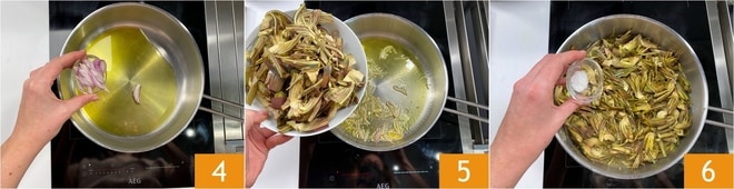 Faites revenir l'échalote dans une grande poêle avec un bon filet d'huile. Lorsque l'échalote est bien fondue, ajoutez les artichauts 5. Faites-les dorer une minute, puis ajoutez de l'eau (environ 50 g) et salez 6.