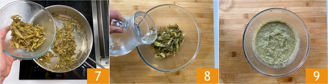 Couvrez et laissez cuire environ 15 minutes pour que les artichauts deviennent bien tendres. Pendant ce temps, mettez sur le feu une casserole d'eau salée qui servira pour la cuisson des pâtes. Dès que les artichauts sont cuits, prélevez-en environ 1/3 et transférez-les dans un bol 7. Ajoutez un peu d'eau de cuisson des pâtes 8 et mixez pour obtenir une crème lisse 9.