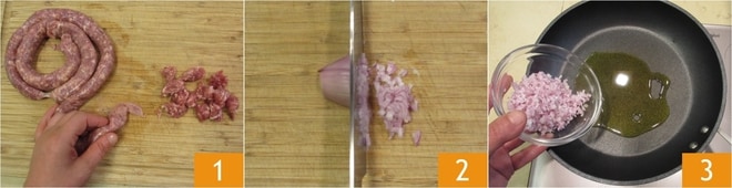 Pour réaliser les pâtes aux cèpes et saucisse, commencez par retirer la peau de la saucisse et émiettez-la avec vos mains 1. Nettoyez et hachez l'échalote 2. Versez l'échalote dans une poêle avec un filet d'huile 3.