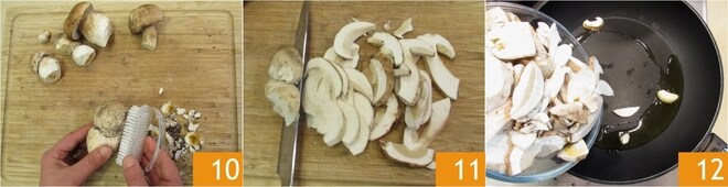 Pendant ce temps, nettoyez les cèpes : retirez la base du pied et frottez délicatement avec une petite brosse pour enlever les résidus de terre 10, puis coupez-les en fines tranches 11. Dans une poêle, chauffez un filet d'huile avec une gousse d'ail, puis ajoutez les champignons 12.