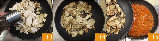 Salez, poivrez 13 et faites cuire à feu vif pendant environ 10 minutes. Lorsqu'ils sont prêts 14, ajoutez les champignons à la sauce avec la saucisse 15.
