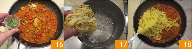 Mélangez bien et aromatisez la sauce avec le romarin haché 16. Faites cuire les tagliatelles dans de l'eau bouillante salée 17, puis égouttez-les dans la poêle avec la sauce 18.