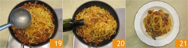 Mélangez les pâtes en ajoutant une paire de louches d'eau de cuisson 19 et un filet d'huile 20. Dressez et servez immédiatement vos pâtes aux cèpes et saucisse 21 !