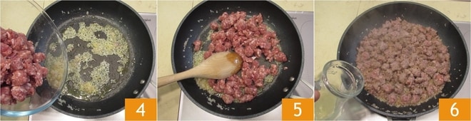 Laissez mijoter l'échalote pendant 5-6 minutes, puis ajoutez la saucisse 4 et faites-la revenir pendant quelques minutes 5. Déglacez avec le vin blanc 6 et laissez-le s'évaporer complètement.