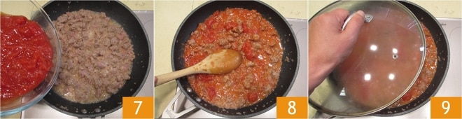 À ce stade, ajoutez les tomates pelées, que vous aurez préalablement écrasées 7, mélangez bien 8 et laissez cuire environ 20 minutes à feu doux, couvert 9.