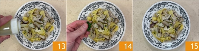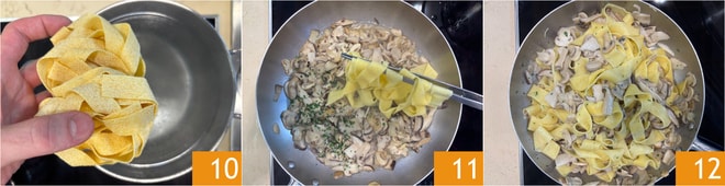 Entre-temps, portez à ébullition une casserole d'eau salée et cuisez les pappardelle 10. Égouttez les pâtes al dente et transférez-les dans la poêle avec les champignons 11, puis faites sauter le tout pendant quelques minutes 12; si nécessaire, vous pouvez ajouter un peu d'eau de cuisson.