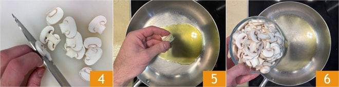 Enfin, nettoyez et coupez également les champignons de Paris 4. Dans une grande poêle, chauffez l'huile avec la gousse d'ail écrasée 5, puis ajoutez tous les champignons 6.