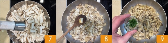 Salez 7 et faites cuire à feu moyen pendant environ 10-12 minutes, en remuant de temps en temps. Lorsque les champignons sont bien dorés et que toute l'eau s'est évaporée, éteignez le feu, enlevez l'ail 8 et parfumez avec le persil haché 9.